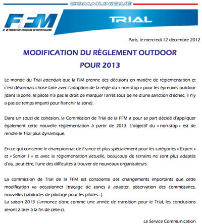 Este es el comunicado oficial que hoy mismo ha hecho público la FFM (Federación Francesa de Motociclismo): "El mundo del Trial esperaba a que la FIM tomase decisiones en materia de reglamentación y esta se ha tomado ya con la adopción de las reglas del "non-stop" para pruebas outdoor (en la zona, el piloto hizo no puede detenerse bajo pena de una penalización de fiasco, no hay límite de tiempo para hacer la zona). En aras de cohesión, la Comisión de Trial de la FFM, también ha decidido aplicar igualmente esta nueva reglamentación a partir de 2013. El objetivo del "non-stop" es hacer el trial más dinámico. En lo que concierne al campeonato de Francia y más especialmente a las categorías "Expert" y "Senior 1" y con la normativa actual, muchos terrenos pueden no ser los más adecuados por lo que, tal vez, sea esta una de las dificultades que encontrarán los nuevos organizadores. La