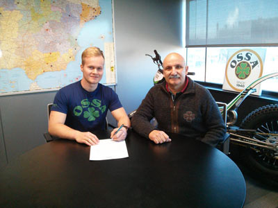 En los últimos años, hemos visto como Matteo se ha ido superando gracias a su compromiso y al apoyo del equipo X4 de Italia y de Ossa, cerrando la pasada temporada con unos resultados muy positivos en la categoría TR2 del campeonato italiano, campeón del X-Trial de Italia, cuarto en el campeonato italiano indoor y tercero del Europeo. Este año Matteo Poli participará en el campeonato italiano outdoor e indoor, en el campeonato europeo y el campeonato mundial con toda la asistencia y apoyo de Ossa. Seguro que podrá superar los resultados obtenidos en la temporada 2012. En la imagen vemos a Matteo Poli en la fábrica Ossa, en el momento de firmar su renovación.