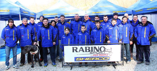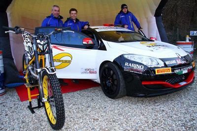 en las zonas del Park Trial Varata. En la presentación también se pudo ver el Renault Megane decompetición patrocinado por el Team Rabino, Sherco Italia, que competirá en la Copa Megane italiana. En la foto derecha vemos a Renato Chiaberto, Alessandro Mondo y Simone Staltari, en la foto inferior todo el equipo Rabino Sherco Italia.
