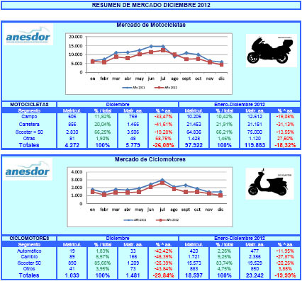 Sobre la evolución del mercado del ciclomotor, el informe detalla: "Los ciclomotores cayeron en diciembre un 29,8% con 1.039 unidades matriculadas. En todo el año 2012 tan solo se matricularon 18.597 unidades, un descenso del 20,0% frente a 2011. Este es el registro más bajo de la serie histórica desde que tenemos datos en ANESDOR, desde 1957. El segmento del ciclomotor tipo scooter concentró el 83,7% de las ventas en 2012."