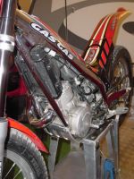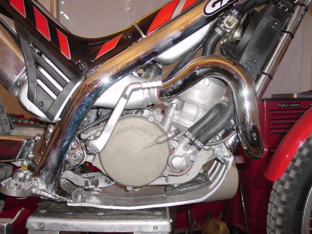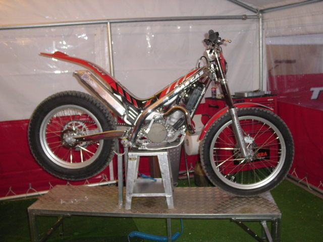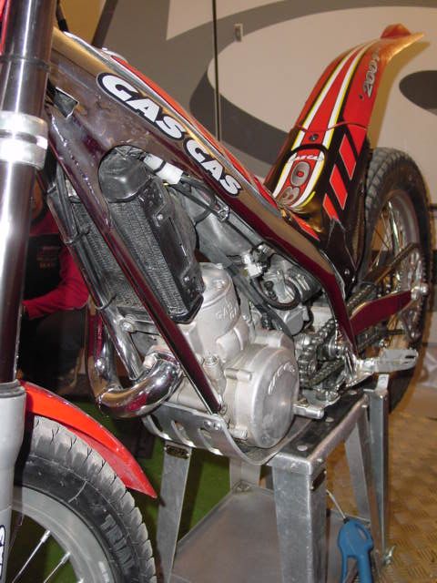 La revolucionaria Gas Gas 2002, de la que ya os hablamos en los previos del trial de Villalonga, fue estrenada por Adam Raga en el trial de Sotillo de la Adrada, y en Todo Trial os ofrecemos las primeras fotos, una primicia mundial. Como veis en las mismas, el motor es realmente pequeño, y completamente distinto, al igual que el chasis. El espacio ocupado por el cambio es ahora casi la mitad, a pesar de seguir utilizando 6 marchas, el basculante lleva la pinza de freno escondida, al igual que las Montesa y Scorpa y se trata de una moto completamente diferente.