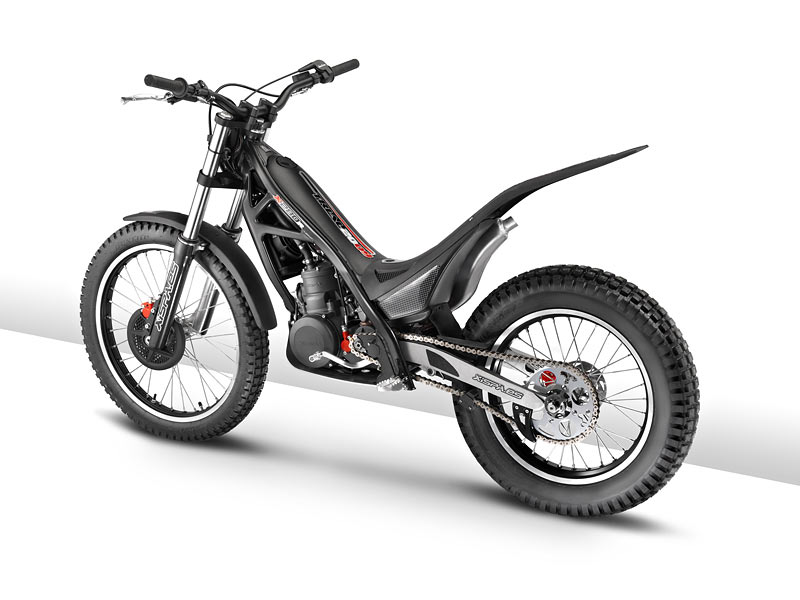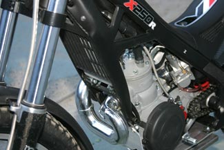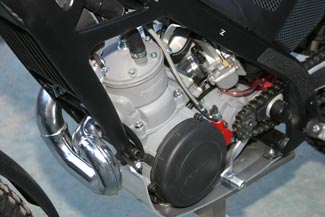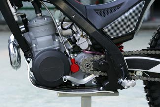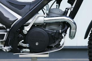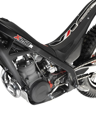 El ligero motor de 2 tiempos cubica 249,9 cc con una caja de cambios de 5 velocidades y embrague hidráulico de 6 discos. La carburación es OKO de 28mm en la versión Racing y DellOrto 26mm para la versión homologada.