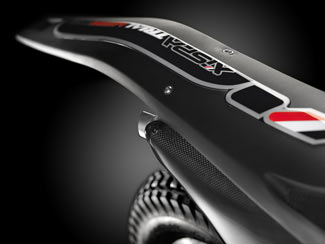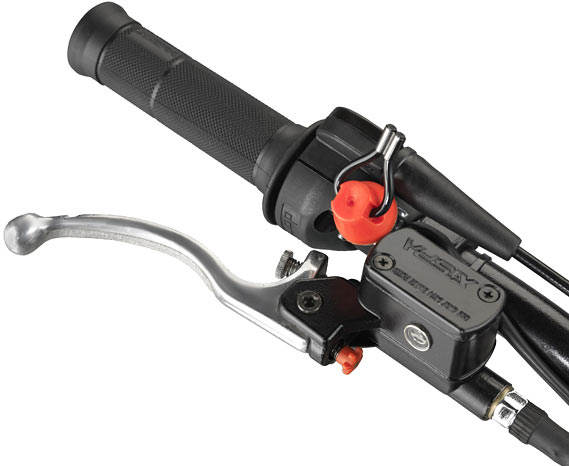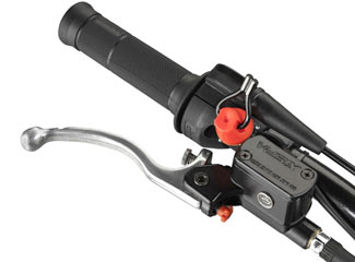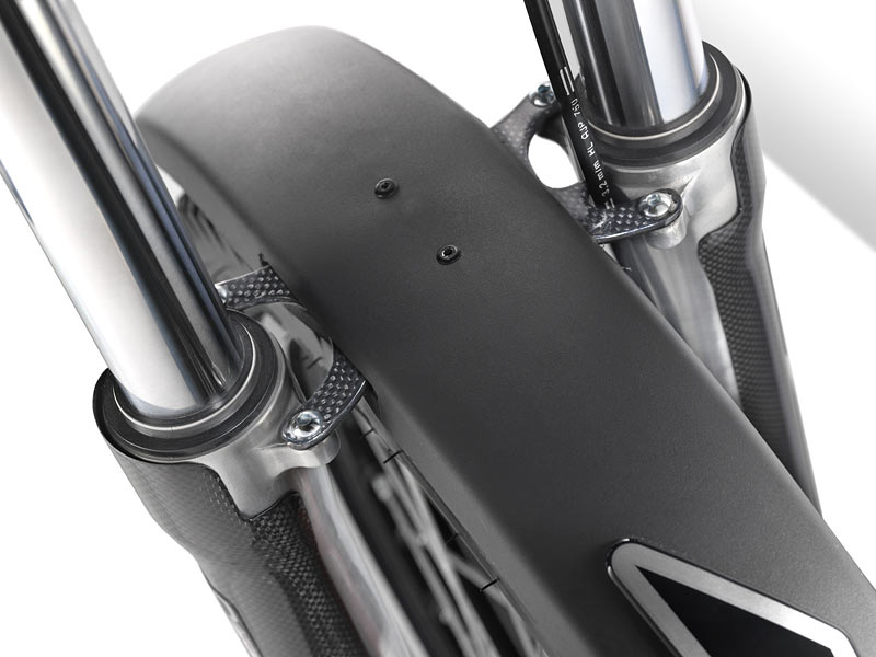 Los neumáticos son Dunlop, la bujía NGK, el puño de gas Domino, y además incorpora detalles como protectores de carbono para la horquilla de la marca Delay, tornillos regulables de las manetas de la misma marca, tiras antideslizamiento en las manetas y el chasis, o el interesante botón de paro con función de antirrobo, además de una practica funda para la moto.