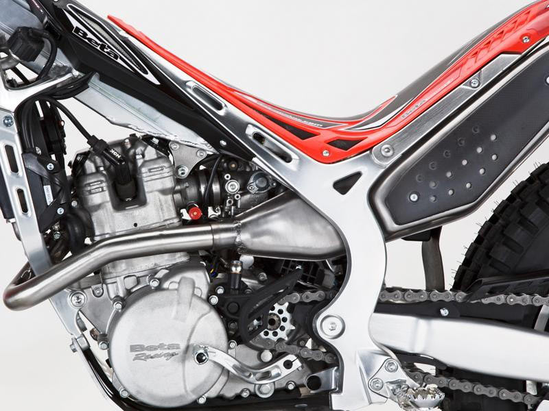 La nueva EVO aporta mayor ligereza que el precedente modelo de Beta 4T, gracias principalmente al chasis monoviga en aluminio con montantes laterales forjados en el mismo material y que alberga el depósito de combustible en su propia estructura.