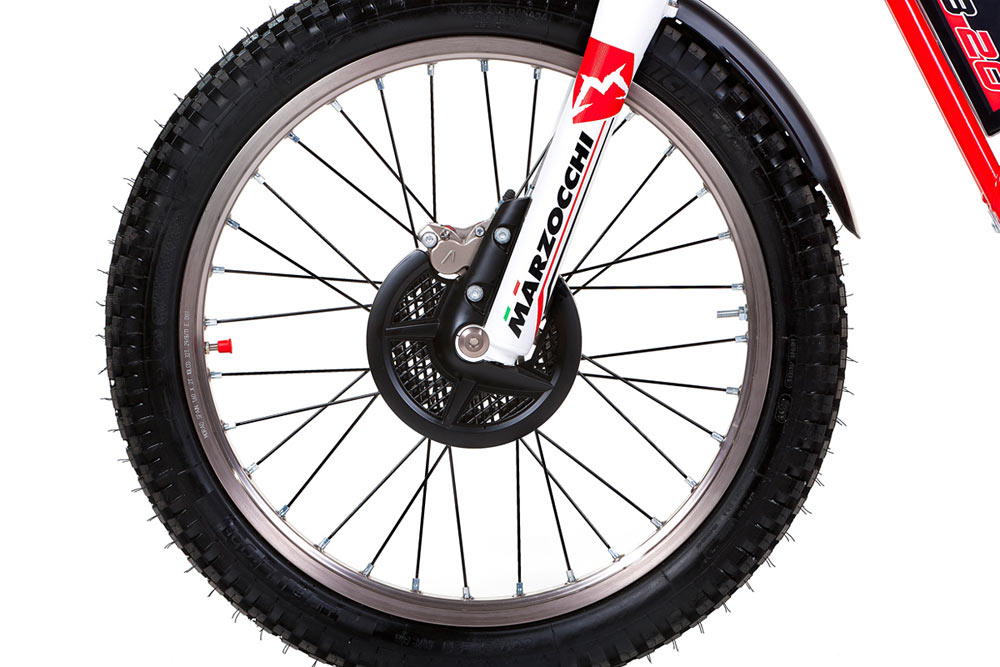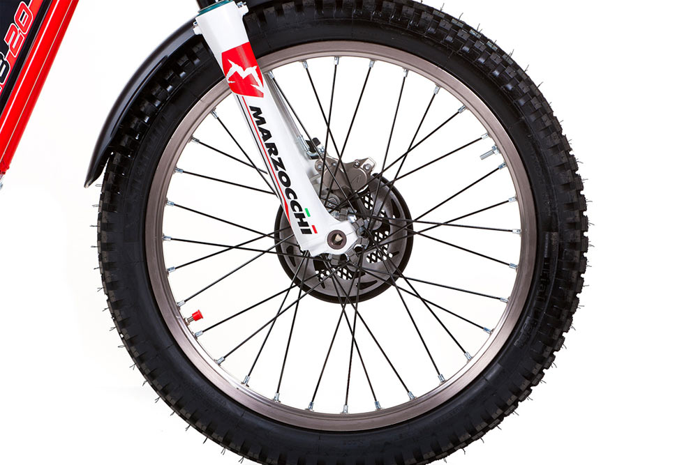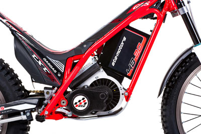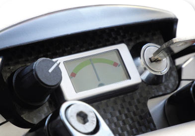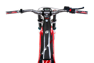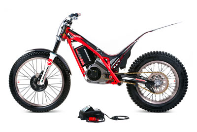 Cuadro de instrumentos: Alimentación y carga del acumulador bajo control. La pantalla muestra el estado del acumulador. Con el potenciómetro se puede ajustar de forma gradual la potencia entre el mínimo (niños, principiantes) y el máximo (expertos en trial). Tomas de carga: robustas y seguras. Las robustas tomas protegen el equipo durante la carga, cuando se producen unos elevados amperajes. Cargador: fácil de utilizar para cualquiera. El cargador recarga el acumulador al 80% en una hora y al 100% en 2,5 horas. Regulador: El centro técnico. El regulador es el corazón de la moto. Controla la extraordinaria potencia y, además, produce una simulación de freno motor durante la reducción de potencia.