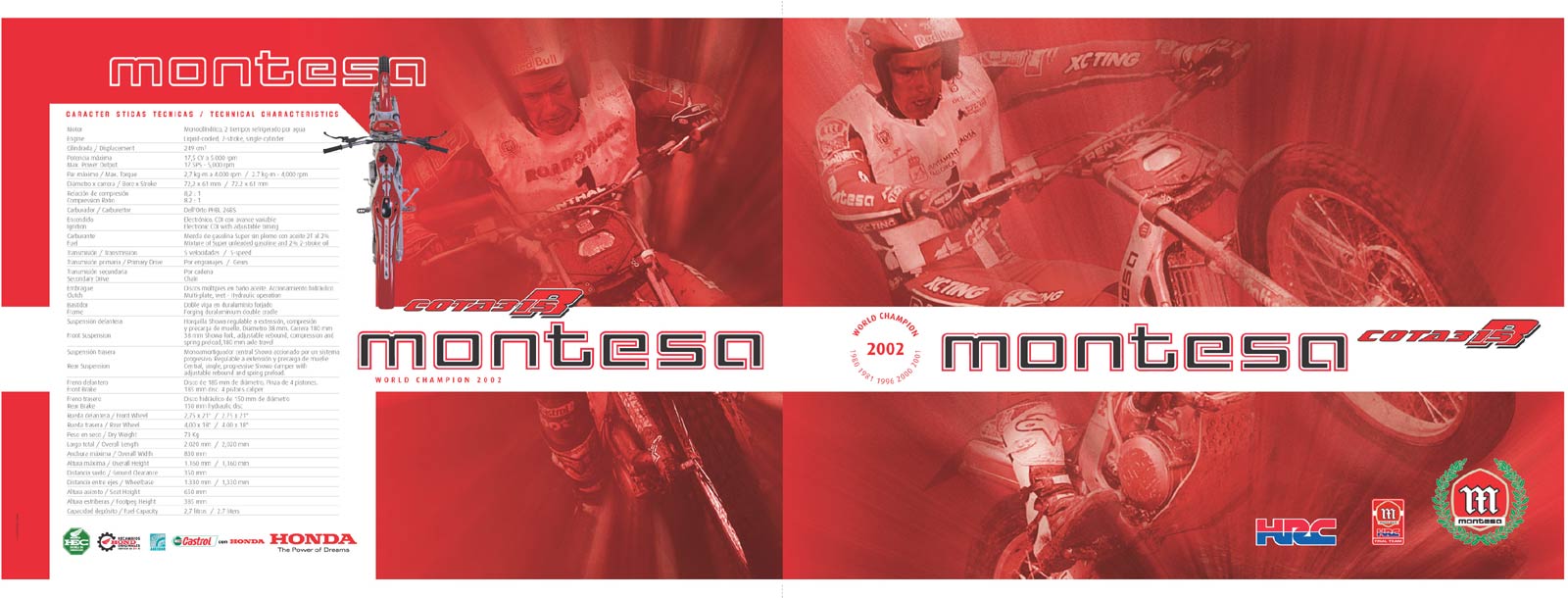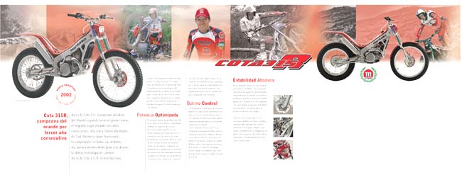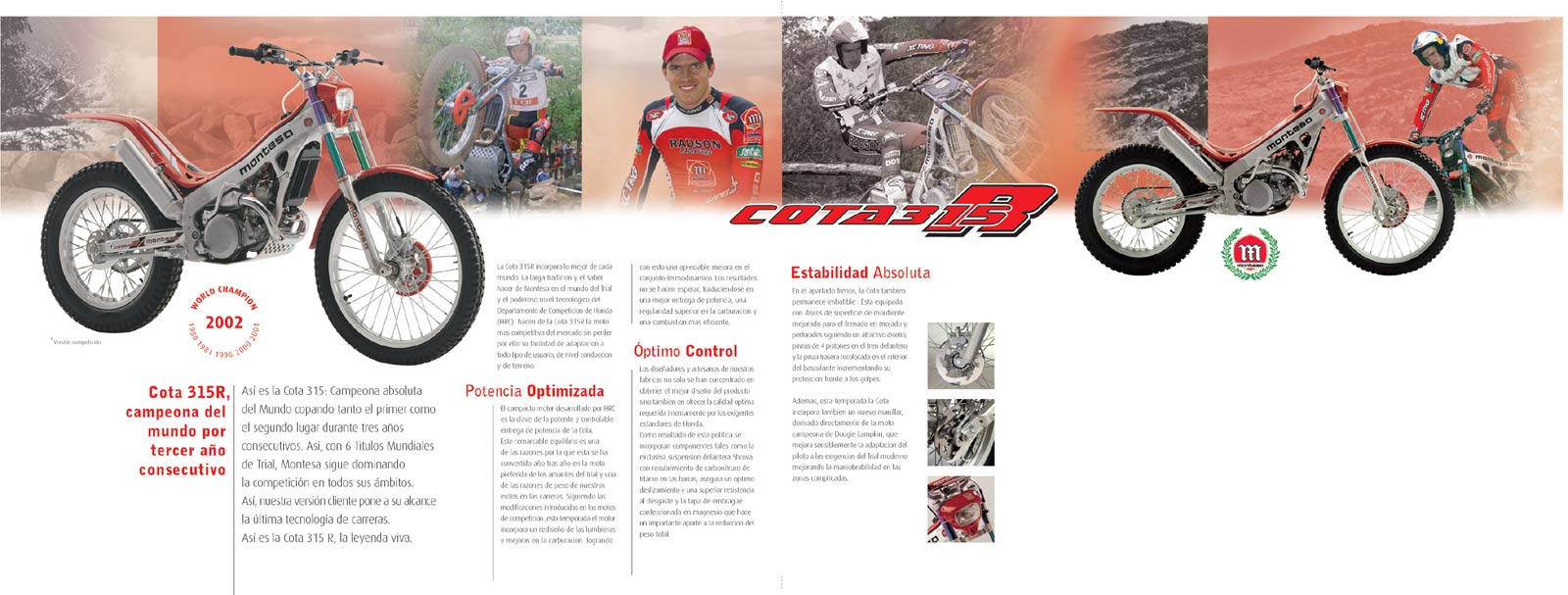 Con la experiencia que avala a Montesa y mas concretamente a su modelo Cota 315 R después de la consecución de un nuevo título mundial, y manteniendo la sólida y efectiva base del conjunto anterior, Montesa Honda, anuncia el lanzamiento de una nueva versión para el año 2003.