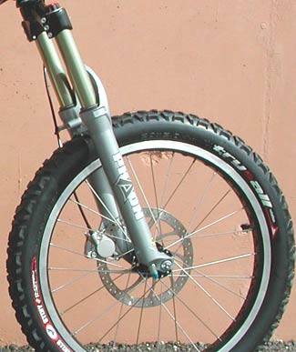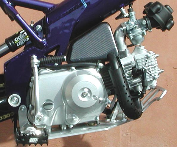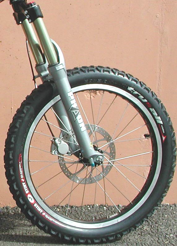 A primera vista podemos ver que el motor es muy compacto, con un cilindro colocado horizontalmente, sobre el que está el carburador Mikuni y un pequeño filtro independiente. El escape es realmente corto, con una petaca que hace de silenciador bajo el chasis. Este es un monocasco, en cuyo interior se aloja la gasolina sin mezcla, ya que es un 4 tiempos. El basculante es al estilo de las bicis de descenso, con un monoamortiguador central regulable. La horquilla delantera también es regulable y procede de este tipo de bicis, ofreciendo una gran rigidez, a la que contribuye la pieza "gorila" incorporada que une las dos botellas. Los frenos son hidráulicos de disco lo que da una potencia de frenado impresionante. El manillar y la potencia (en lugar de tijas) es de estilo bici de Bike Trial, con lo cual el ángulo de giro es casi ilimitado y el sillín también es de Mountainbike. En lugar de estriberas utiliza pedales, claro que fijos ya que no hay que pedalear, pero giratorios para facilitar todo tipo de maniobras. Bajo el motor hay una placa cubrecarter para apoyos haciendo trial. Sin duda una moto muy especial cuyos límites seguro que estan muy altos.