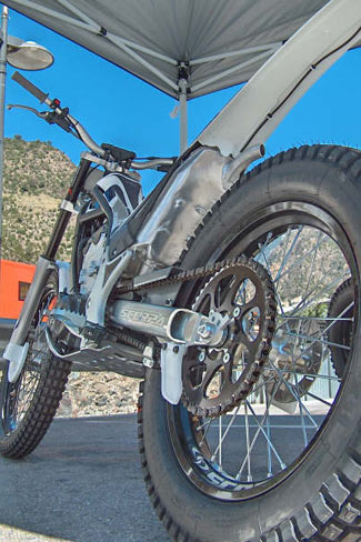 El chasis la Scorpa 4T destaca por su gran calidad, al estar construido por tubos acero 15COV8 en su parte superior y por dos pletinas de alumino mecanizado 6082, ofreciendo uno de los bastidores más ligeros de trial, con un peso de 2,7 kg.