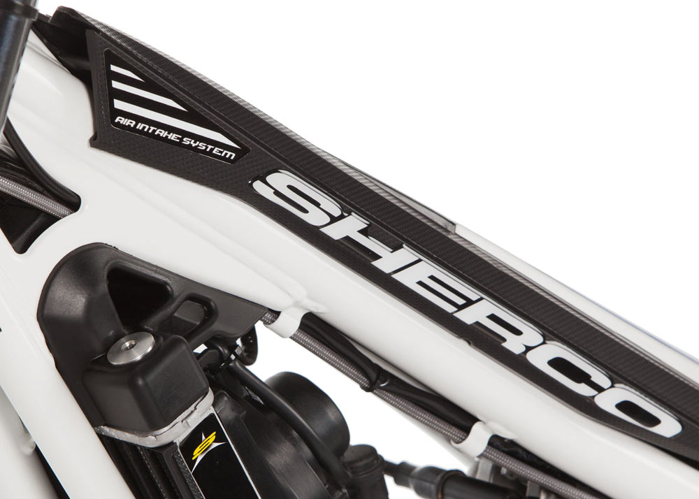 Todo el conjunto ha permitido que la alimentación atmosférica del motor sea aún más fluida, permitiendo regímenes de giro extraordinariamente altos a los motores Sherco, con una progresión de revoluciones y entrega de potencia lineal excelente a cualquiera de sus etapas. La ubicación del filtro de aire en la parte delantera de la moto, permite una mayor capacidad de vadeo de tramos de agua, muy superior a los modelos con filtro bajo el asiento. Además, en caso de inundación por caída, tanto el airbox como el compartimento del filtro, disponen de drenajes para evitar la entrada de agua accidentalmente en el motor.