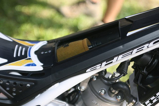 Otra de las grandes novedades que presenta la nueva Sherco 2012 es la nueva caja de filtro con un nuevo diseño, más compacto y accesible, a la vez que ha permitido la mejora considerable del airbox que canaliza la entrada de aire hacia el filtro. El nuevo diseño, mucho más compacto también ha permitido una nueva tobera de admisión y el reposicionamiento del nuevo carburador Keihin de 28.
