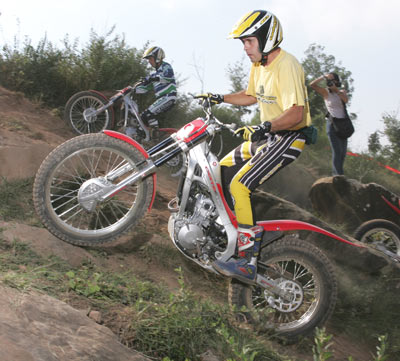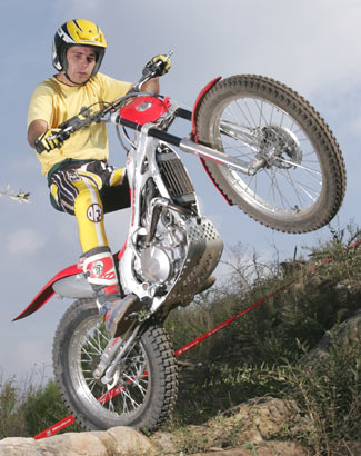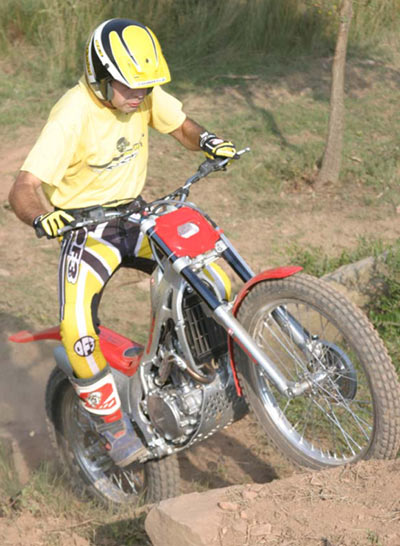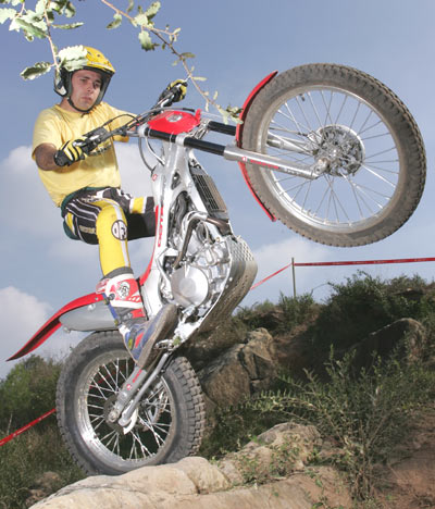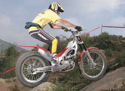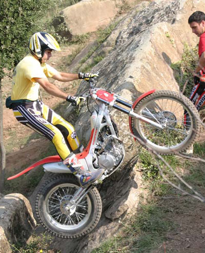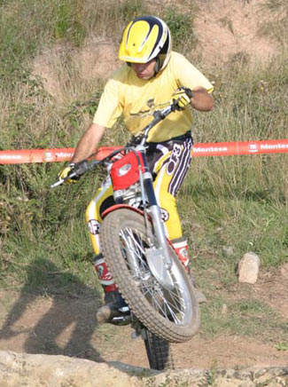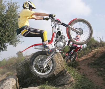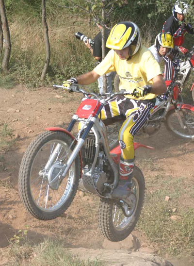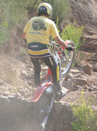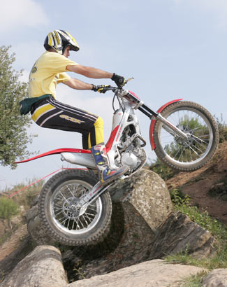 Equilibrio y cambios en parado. Me dispongo a probar la moto en otro tipo de maniobras, equilibrio y cambios en parado. La sensación de peso no es superior a la de una Cota 315, aunque sí en comparación con mi Pro. En algunos momentos la siento cabezona, pesada de la parte delantera. Sin embargo realizo perfectamente giros con la rueda delantera levantada en el aire, para lo que necesito dar muy poco gas. La moto se hace manejable, fácil de utilizar, pero claro, más pesada y cabezona que una Sherco o una Gas Gas Pro. Lo mismo a la hora de mantener el equilibrio en parado, me cuesta algo más que en las motos de otras marcas, aunque es más o menos como me sucedía con la Cota 315. Quizás el haber reducido unos grados el avance de la horquilla también perjudique un poco en este sentido.