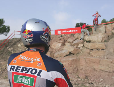 Llega la hora de la comida y me acerco a las zonas de piedras en las que Lampkin, Fuji, Freixa y Laia habían hecho la exhibición, no están pensadas para la prensa, pero como no hay nadie mirando, me tiro a ellas. Primero le doy a la empinada subida de tierra que hay junto a la zona de la escalera tipo castillo indoor y la moto sube como si nada, casi a punta de gas, con una tracción perfecta, es una gozada. La bajada como en una 2T pero con retención. Después voy a las zonas de piedras y me hago algunas por los escalones sencillos, y compruebo que la respuesta no tiene nada que envidiar a las 2T, aunque a la moto le falte la ligereza y manejabilidad de una Pro o una Sherco 2T.