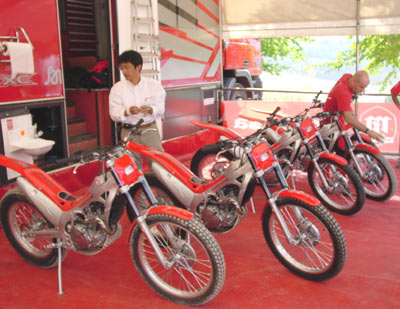 Espero que nadie se me adelante y me quite la moto que me han asignado, la mía es la número 5. Mira que casualidad, precisamente ya no queda ni una moto cuando llego al camión, noooooooo. Estoy apunto de patalear como un niño al que le han quitado el caramelo cuando llega Albert Cavero a la carpa subido en una. Nacho Bertrán y yo nos tiramos a por ella como si fuese una piñata... pero Oscar, el mecánico habitual de Lampkin me dice que es la numero 5, o sea, que es la mia, jejejejeje. La agarro del manillar, ¡esta no me la quita ya nadie!