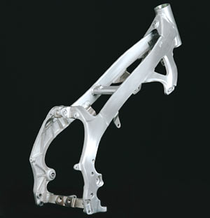 En el nuevo chasis se ha intentado reducir toda la zona de apoyo del piloto, la zona de las rodillas, estriberas y motor, siendo ahora más estrecho y más manejable. El depósito queda totalmente integrado y es también de aluminio.
