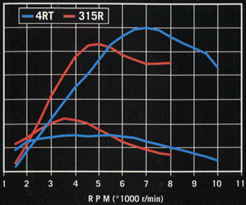 Analizando las curvas de potencia ofrecidas por la marca, se ve que la cifra de potencia máxima es más elevada que en la 2 tiempos, aunque se consigue a un número de revoluciones mayor, entre las 6.000 y las 8.000 rpm, mientras que en la 315 se obtenía el pico de potencia entre las 4.000 y las 6.000 rpm. Sin embargo la curva de par es mucho más amplia en el motor 4 tiempos, muy llena en todo el rango de revoluciones, mientras que en el anterior motor 2 tiempos sólo sobresalía entra las 2.000 y 5.000 rpm.