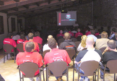 Según el horario previsto, y tras "babear" un rato con las clásicas de trial, las Cota 315 campeonas del mundo y la nueva Cota 4RT, pasamos a un pequeño y acogedor salón de actos en el que se emitirán unas proyecciones de video y se irán explicando detalladamente todas las novedades y detalles técnicos de la Cota y de la gama de quads y enduro.