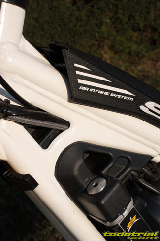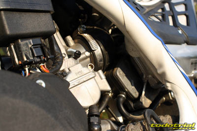 Por tanto no hace falta ni una herramienta para quitar y poner el filtro y se hace en cuestión de segundos. Algo importante para aquellos que por ejemplo, tienen que sustituir el filtro y hacer operaciones de mantenimiento en apenas unos minutos al encontrarse en un parque cerrado y con tiempo limitado en plena competición, como es el caso de los SSDT o los 3DTS. La tobera de admisión ha sido rediseñada para conseguir que el carburador esté mucho menos inclinado, buscando una posición más correcta, un detalle muy importante. La tobera del carburador a la caja de filtro también ha sido rediseñada y ahora dispone de unas canalizaciones, al igual que la caja del filtro, para evitar filtraciones de agua y suciedad. De este modo es prácticamente imposible que entre agua al carburador. También es de agradecer la incorporación de serie del carburador Keihin de 28, que sólo lleva de serie la 290 y 300, pero no la 250. Este carburador proporciona mucho mejor tacto, así como mejora los bajos y la estirada. La única pega es que la palanca del starter queda bastante escondida siendo de dificil acceso.
