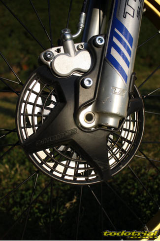 Las pinzas Fórmula tienen una ventaja importante respecto de las anteriores AJP y es que están fabricadas en una sola pieza, lo que hace que la frenada sea más precisa porque no hay variaciones como en las anteriores pinzas que estaban echas en dos piezas. Nuestra unidad de pruebas no contaba aún con los elementos Fórmula equipando los AJP, por lo que no os podemos detallar más estos aspectos. Los discos sigen siendo los habituales, con un perforado tipo floreado en la parte central y por tanto con el perfil circular, tal como obliga la reglamentación. Más detalles Seguimos con el repaso minucioso a todos los detalles de la Sherco 2012, por mínimos que sean con el sistema de guiado del latiguillo del freno delantero, que aunque parezca que no tiene importancia en algunas otras marcas ha ocasionado problemas incluso graves, como es el caso de Gas Gas y el roce de éste con las botellas arruinando su cobertura.