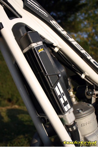 Pero con tantísimo material listo para salir, no queremos que os empachéis, así que sentaros cómodamente y disponéos a leer bastante. Para no cansaros demasiado iremos publicando la prueba paulatinamente en varios capítulos. Comenzamos con el... 1. Análisis estático Comenzamos este análisis con un repaso visual a la moto. La estética es una cosa muy personal, pero seguro que casi todo el mundo coincidirá en que la nueva Sherco es preciosa y con un aspecto muy atractivo y "racing". Los elementos dorados como las llantas o las tijas mecanizadas junto con el chasis blanco y los adhesivos azules y amarillos aportan una belleza clásica y muy elegante, sin necesidad de acudir a estridencias como colores fuertes o exceso de negros. El aspecto general es muy agradable y al fijarnos detenidamente apreciamos interesantes detalles de acabado y también de calidad, tanto en el sentido de su diseño e ingeniería como en el de sus componentes.