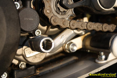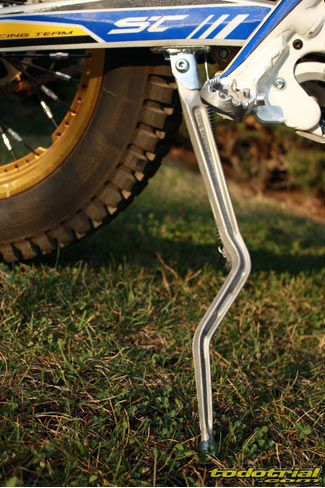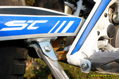 Siguiendo con la rueda trasera, los ejes son aligerados y de desmontaje rápido, el delantero con una simple llave allen y el trasero con un tornillo allen por un lado y tuerca por el otro, mientras las excéntricas y bujes son los habituales. La pata de cabra es probablemente la mejor de todas las motos actuales, está realizada en aluminio para menor peso y al tener forma de "S" se integra perfectamente en el basculante al plegarse. No molesta, no golpea, no tropieza con las piedras. Al estar desplegada su punta es más ancha formando más base y con ello haciendo que el apoyo mejore en todo tipo de terrenos y no se hunda en lugares blandos, como ocurre en otras marcas. Al levantar la moto no se pliega sola dándonos desagradables sorpresas, sino que se mantiene en su sitio, lo cual se agradece, y no es esta que la subimos un poco hasta que se pliega del todo dejando actuar el muelle. Hasta aquí sólo la primera parte de la prueba de la Sherco ST 290 2012. En el próximo capítulo arrancamos la moto e iniciamos el análisis dinámico...