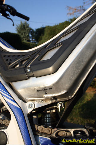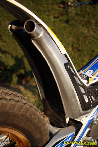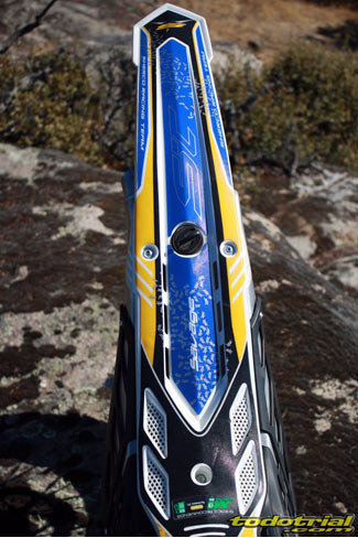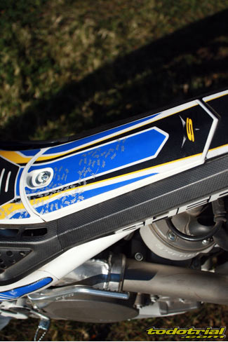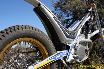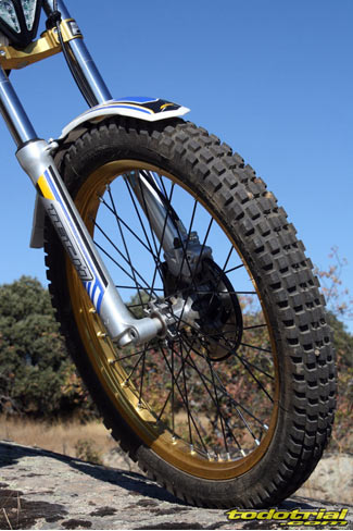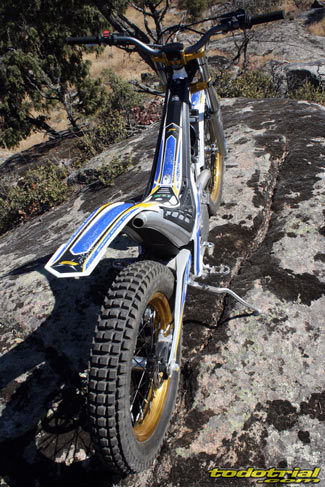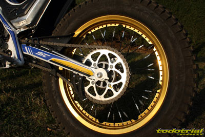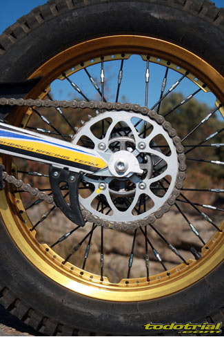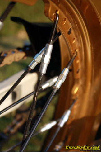 El conjunto depósito-silenciador lleva por su parte inferior una goma de protección que hace las veces de faldón del guardabarros trasero. El conjunto es muy estético y sólo le encontramos una pequeña posible mejora, que podría ser la ampliación de la goma hacia los lados a modo de lugar por donde poder levantar la moto desde la parte trasera en caso de necesidad, como sí disponen otras trialeras, ya que no hay por donde cogerla cómodamente para hacer este tipo de operaciones. Una interesante novedad del modelo 2012, es la incorporación de la llanta trasera con nervio central para el anclaje de los radios, que el año pasado sólo la incorporaba la Cabestany Réplica. De este modo ya nos podemos olvidar de las molestas pérdidas de aire por las cabezas de los radios a causa del mal ajuste del flap. Los radios ahora se tensan en su parte central y sus roscas vienen selladas con silicona para evitar que se aflojen facilmente. El anodizado dorado de las llantas le da un aspecto muy bonito y elegante que resalta aún más con los radios de color negro.
