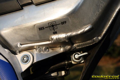 La placa cubrecárter de duraluminio es también nueva. Ahora proteje mejor el motor y absorbe mejor los impactos, además de disponer de una nueva goma intermedia entre este y el motor. Cuando apoyamos en un obstáculo cumple su cometido y es lo único que toca de los bajos de la moto, y no algunas partes del chasis como sucede en otras motos. "Carrocería" A diferencia de las primeras unidades de la ST ahora el depósito cuenta con grifo de gasolina situado en la parte inferior. Está realizado en Aluminio Ergal desde el modelo 2011, con la bomba de combustible integrada. Su capacidad es menor que en los anteriores modelos de Sherco con depósito tradicional. El tapón de gasolina está situado en el centro del guardabarros trasero, novedad que ya se introdujo el año pasado y que mejora el anterior sistema lateral, haciéndo mucho más cómodas las operaciones de repostaje. La pega es que resulta bastante duro para poner y quitar, ya que el nervio que tiene para girarlo es bastante pequeño.