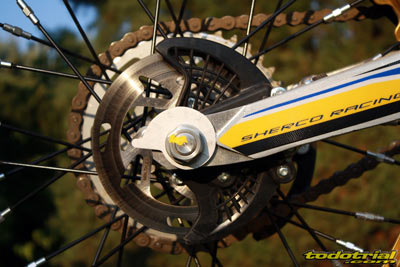 El tren trasero, monta también un nuevo monoamortiguador marca R16V muy superior al anterior. Pero lo importante aquí no es solo el amortiguador, sino el trabajo realizado en el chasis, que junto con las nuevas bieletas, se ha reformado para conseguir una nueva posición en el amortiguador que ayuda a trabajar de forma mucho más precisa al conjunto amortiguador-bieletas. En comparación con el anterior modelo, la absorción de obstáculos es mucho mayor a la vez que aumenta de manera considerable la tracción en cualquier condición del terreno. El basculante es el habitual, de tipo banana realizado en aluminio, y como buen detalle incorpora también unos buenos adhesivos gruesos de protección. En él se ancla la pata de sujección. Frenos Apenas hay variaciones en el conjunto de los frenos, pero hay que destacar la incorporación de las pinzas y bombas Fórmula de embrague y freno, que han mejorado sensiblemente la capacidad de frenada. Además de lo comentado ya en el apartado de "mandos" y la mejora a nivel de regulación, el tacto de los elementos varía respecto de los anteriores AJP, así como posiblemente respecto de los componentes de la misma marca montados en otras motos. En Sherco se trabajó desde el primer momento codo con codo con el fabricante, y el resultado parece haber sido satisfactorio.