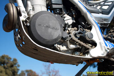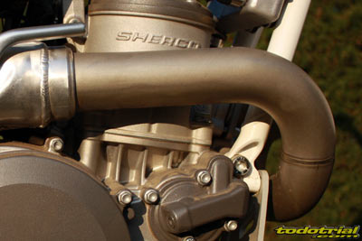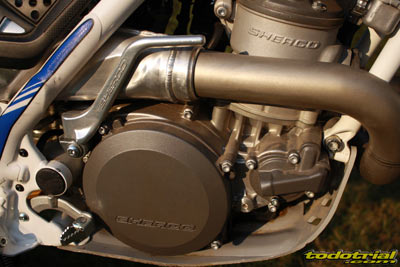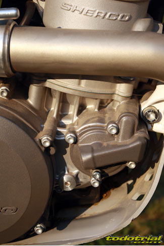 Lo que sí es nuevo es el encendido, que ha pasado de tener 8 bobinas a 12. Este cambio es más importante de lo que parece, ya que hace ganar al motor aún más progresividad en los aumentos de régimen, ofreciendo mejor tacto y eficacia. La bomba de agua está integrada en las Sherco ST, por tanto no dispone de manguitos exteriores evitándo los problemas que el desgaste de estos o de sus bridas podían ocasionar. Es uno de los detalles que distinguen a un motor de nueva factura de otro con ya algunos años encima. La tapa de embrague deja apreciar el gran tamaño de los discos y maza de embrague, como siempre en Sherco al estar pensados exclusivamente para el trial aportando mucha precisión y tacto. El embrague de tipo multidisco en baño de aceite y con mando hidráulico no ofrece ningún problema y está hecho a prueba de bombas. No hay variaciones en este aspecto, ya que el embrague siempre ha sido uno de los mejores puntos a favor de Sherco.