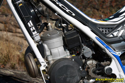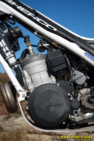 Las manetas y bombas de freno y embrague que llevaba nuestra unidad de pruebas eran las habituales AJP grandes, de reconocida eficacia. No obstante las unidades posteriores llevan los nuevos elementos Fórmula, que aunque inicialmente pecaban de falta de tacto han sido muy mejorados en sus series actuales, contando además con la ventaja de la múltiple y fácil regulación de la distancia de la maneta y con el sistema que impide que se rompan, ya que en lugar de ello se doblan hacia atrás. No obstante el tacto es diferente de las AJP y todo es cuestión de acostumbrarse o de encontrar los reglajes más adecuados o incluso algunas modificaciones. Conjunto motor El motor no ha variado en su conjunto, pero los cambios en filtro, toberas, posición del carburador y encendido, hacen que todo el conjunto respire mucho mejor y haya mejorado aún más su comportamiento. El motor de la Sherco 2012 sigue la línea de todos los modelos precedentes, manteniendo un excelente par, con unos bajos medios y altos excelentes y con una subida de vueltas muy lineal, a la vez que rápida si se lo exigimos. El 290 es muy potente a todo régimen, y tampoco es brusco sino apto para todos los públicos.
