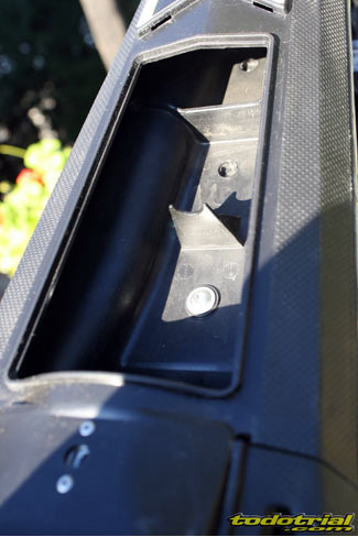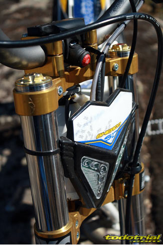 En la Sherco el guiado del latiguillo pasa por el puente de horquilla, por cierto muy pequeño y ligero, y por una pequeña pieza de plástico anclada en la tija inferior, y por tanto independiente del faro delantero. Esto posibilita que se pueda quitar el faro fácilmente para sustituirlo por la típica placa portanúmeros en algunos triales, lo cual también es de agradecer. Hablando del faro delantero, es de leds, minúsculo y con un diseño muy trialero y moderno, de los mejores que podemos encontrar y muy ligero. Otro detalle es que venía con una pequeña palanca como interruptor de luces, evitando la siempre molesta y aparatosa piña de luces del manillar, ya que también el botón de pare está situado en el centro del manillar. El faro trasero va por debajo del guardabarros, sin apenas molestar y es fácilmente extraíble. Por supuesto hablamos de la unidad para hacer trial, ya que también se puede instalar el kit de matriculación con los absurdos interruptores de intermitencias y demás.
