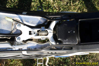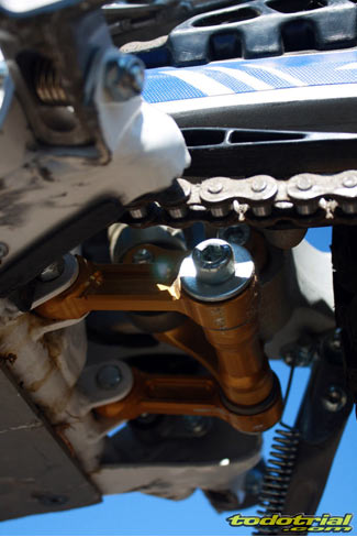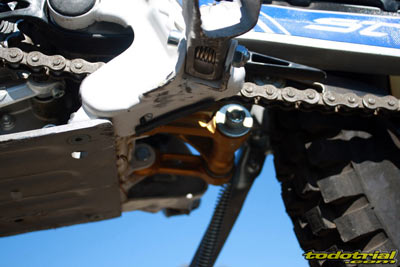 Un buen detalle son las protecciones laterales del depósito y del silenciador, que como sabéis son simétricos, estando a la derecha el escape y a la izquierda el depósito, siendo ambos de aluminio. Suspensiones Las nuevas suspensiones son una de las principales novedades de la Sherco 2012, y sin duda se trata de uno de los elementos que más influyen en la notable mejora de su comportamiento. Han convertido a la moto en mucho más ágil, con una mejor absorción de las irregularidades del terreno, indistintamente de sus características. La horquilla delantera es la nueva Tech3, que marca una clara diferencia con la anterior logrando una mejor suavidad, agilidad y eficacia de funcionamiento. Las nuevas bieletas son más robustas y anclan el nuevo amortiguador en una posición diferente, aunque aún siguen estando algo expuestas a los golpes.