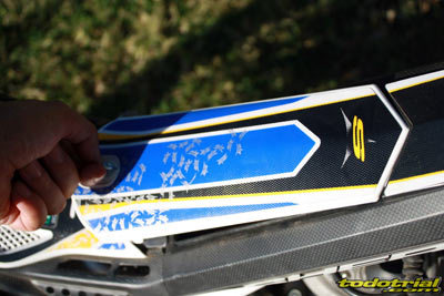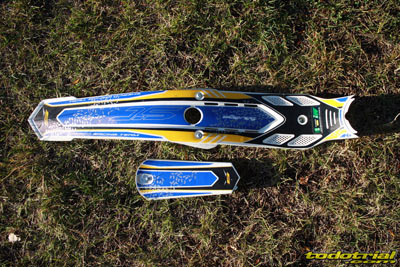 Los guardabarros son de un plástico muy flexible y de altísima calidad, resultando prácticamente imposible romperlos, por lo que se acabaron hace tiempo esas contínuas y molestas roturas de guardabarros. Su diseño es muy estético y moderno. El delantero es un poco más corto de lo habitual para evitar encajarse en algunos pasos y el trasero es muy fino, permitiendo que se pueda doblar hacia arriba o hacia abajo casi como si fuese de goma. La única pega es el profundo agujero en el centro del guardabarros trasero, más bien en lo que sería el "asiento" y que sirve para el acceso al tornillo de anclaje, ya que en él se acumula el barro. Los adhesivos presentan una calidad muy mejorada, son gruesos y con relieve tipo "panal de abeja" que los hace más resistentes y atractivos. Hay detalles interesantes como la utilización de estos adhesivos también para protección de parte del chasis, zona de las estriberas, basculante y horquilla, lo que siempre es de agradecer para proteger nuestra moto de ralladas y dejarla como nueva simplemente con un nuevo kit de adhesivos.