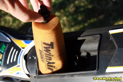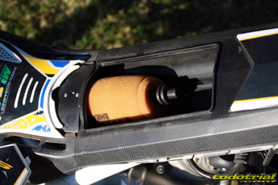 Una de las principales novedades es el filtro de aire completamente rediseñado. Como sabéis está hubicado en la parte donde normalmente estaba el depósito de gasolina, haciendo así que el centro de gravedad de la moto baje y favoreciendo además la profundidad de vadeo así como la menor acumulación de suciedad. La nueva caja de filtro es más pequeña y totalmente estanca por lo que a filtraciones de agua y suciedad se refiere. Además ahora el circuito de aire es mejor y más directo, para ello la parte delantera de la caja es ahora de forma más cuadrada, sirviendo de entrada de aire y sobresaliendo del chasis. Pese a que la caja del filtro es más pequeña, permite respirar mejor al motor, ya que el caudal de aire hacia él es mucho más fluido. La parte baja dispone de canalizaciones de agua, para evitar que esta llegue al carburador. La tapa del filtro está anclada con una anilla rápida de clic, con lo que se quita en un segundo. El elemento filtrante es ahora en forma cónica, con lo que se ensucia aún menos y se encaja muy fácilmente con la mano.