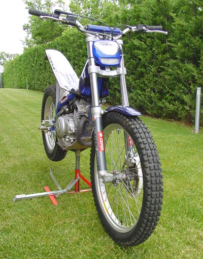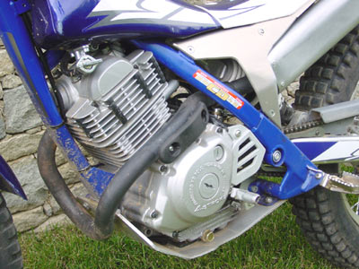 Al poner la moto en marcha, y teniendo cerca alguna 2002, lo primero que se aprecia es que el característico sonido de admisión del motor Yamaha se ha reducido bastante, y es que la caja de filtro se ha modificado interiormente (no en medidas exteriores), colocando unas pequeñas láminas en el interior de los laterales que disimulan, y mucho, el peculiar sonido de "succión" de los motores de trial de esta marca japonesa. En frío hay que tirar del starter situado en la parte derecha del carburador, que es bastante accesible, y aunque la maniobra es algo dificultosa con los guantes puestos, el tirador rojo es perfectamente visible y simplemente agachándose un poquito el tema se soluciona.