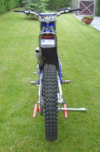 El guardabarros trasero, de salida muy horizontal, monta en esta unidad una bonita placa portamatrícula que incluye el piloto de luz, pero de menor tamaño que en la moto de serie, en la línea de los kits de 150 y 170 cc comercializados por Scorpa. La gran distancia del guardabarros a la rueda debido a su forma recta hace que la placa portamatrícula, por otro lado muy flexible, aguante bien las posibles torsiones y tampoco esté expuesta a topes al comprimirse la suspensión trasera. El aspecto en nuestra opinión es bonito y le da a la moto un cierto toque de agresividad.