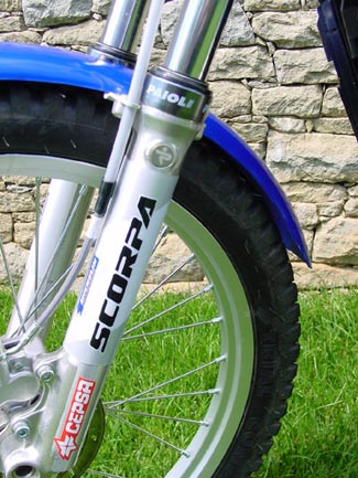 Lo más destacable en la Scorpa con respecto a las otras marcas es el peculiar sistema sin bieletas de la suspensión trasera, conjuntado con el larguísimo amortiguador Sachs. Ello hace que la capacidad de tracción de esta moto sea muy superior a las demás, y por otra parte, las reacciones de la suspensión trasera especialmente al pegar contra un escalón importante sean absolutamente peculiares, tal como nos demostró Alcaraz durante la prueba, y es que la suspensión trasera de la Scorpa, lejos de catapularte hacia arriba lo que hace es que la rueda trasera "copie" el escalón, con lo que en el primer momento da la sensación de que te quedas clavado abajo, aunque después la moto sube de una forma absolutamente neutra y sin perder casi nada de tracción en el canto del escalón debido a que la rueda practicamente no despega del suelo.