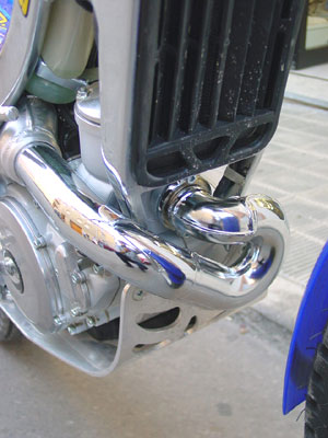 Este desarrollo algo más largo viene como anillo al dedo a un propulsor más lleno y potente (en torno a los veinte o veintiun cv), con una curva de potencia muy lineal, aunque ya el motor de la 2001 tiene una excelente reputación el mundillo trialero por su carácter y potencia. Uno de los responsables de las buenas sensaciones que transmite el motor de la Sherco es el peculiar escape de la moto, con un solo silencioso, que fue una apuesta fuerte de la marca en el modelo 2001, rompiendo moldes entre las motos de trial, y que en la nueva versión de la moto azul se mejora aún más, variando algunos elementos interiores y aumentando el grueso de la plancha exterior de 1mm a 2 mm con lo que se consigue una mayor resistencia a los golpes o caídas. El nuevo protector exterior también contribuye a darle mayor resistencia a la vez que puede ayudarnos a mover la moto en caso de apuros sin temor a chamuscarnos la mano.