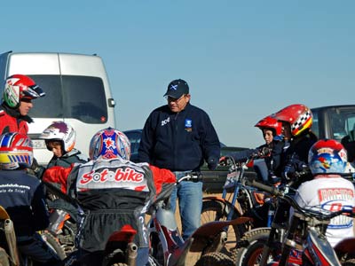 Como ya es costumbre, Soler se dedicó primero a observar como calentaba cada niño para después juntar al grupo y uno por uno decirle que tenía mal en la puesta a punto de la moto, manetas sueltas, gomas con presión inadecuada, manillar demasiado avanzado, etc. , siguió con la postura de pilotaje, piernas demasiado abiertas, rodillas poco flexionadas, demasiada rigidez, etc... , y terminó con una explicación de pesos y centros de gravedad. Después de los consejos preliminares comenzó el trabajo en zona con técnicas de control de la máquina en rampas y los giros complicados.