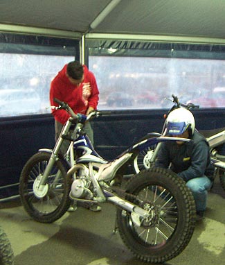 Bajo la carpa del camión de Scorpa, estaba la montura cedida por la marca, y junto a ella una 125 4T y una Scorpa 4 Tricks. Después de unas breves indicaciones del simpático Carles, arrancamos la moto y tras una breve toma de contacto, lo único que hemos de ajustar para mi gusto es la maneta de freno delantero. Todo lo demás está perfecto, aunque aprecio cierta dificultad para encontrar el freno trasero, supongo que pronto me acostumbraré. A partir de este momento dispongo de la moto como si fuese mia.