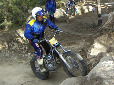 Vista la primera zona, practico unos escalones cercanos muy parecidos a los de la zona uno. Entramos y perfecto aunque la hago a varios, la moto reacciona muy bien. Ahora vendría una interzona más larga, pues la zona dos y tres no la hacemos los amarillos, que es mi categoría. Tenemos así tiempo suficiente para aclimatarnos y apreciar las bondades de la suspension, es magnífica tanto la horquilla como el amortiguador, realmente equilibrados, genial. Carlos me comentó que Paoli fabrica una versión especifíca para Scorpa, desde luego yo quedé encantado.