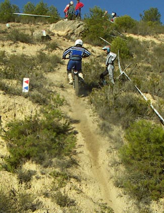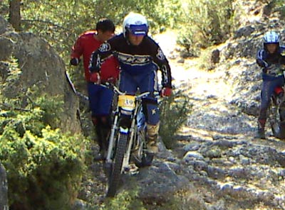 En una de las zonas con una fuerte subida y raíces que hacian difícil la ascensión, se me ocurre trazar por el paso de los verdes. Meto segunda y con un fuerte acelerón volamos sobre el obstáculo y conseguimos salvarla con solo dos pies. Genial, teniendo en cuenta que la mayoría de pilotos de mi categoría hicieron fiasco, y que el único que la superó anteriormente fue con varios... no esta mal.
