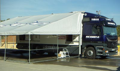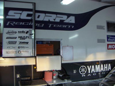 Meto la moto en la carpa de Scorpa y Carles, que viene haciendo las labores de mochilero de Nozaki y que en 2006 será el relaciones publicas de la marca en España, se pone manos a la obra con mi moto como si fuese la del mismísimo Nozaki. Me revisa la moto, filtro, cadena, hace el repostaje... ¡esto es un lujo!