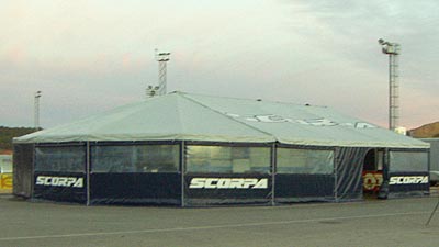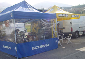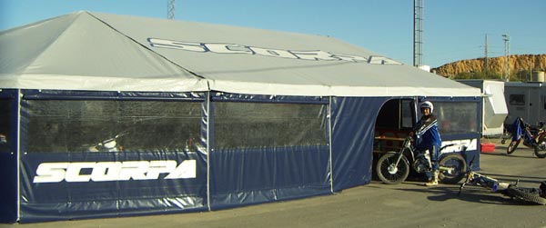 El jueves día 8 de Diciembre sobre las 13 horas, nos acercamos al polideportivo Camilo José Cano de La Nucía, donde estaría situado el paddock de los 2 Días Internacionales de Trial de La Nucía. Allí algo destacaba sobre el resto, un impresionante camion de Scorpa, instalado con una magnífica carpa. Nos acercamos y nos encontramos con Carles Barneda, en la actualidad mochilero del mundialista japonés Fumitaka Nozaki y relaciones públicas de la marca francesa en España.