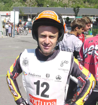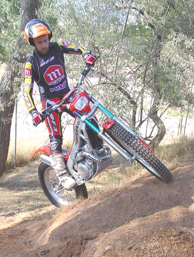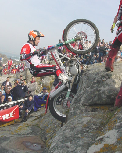 Y es que estar esperando para entrar en una zona y tener al lado a Amós o a Colley, que van a hacer la misma zona que tu, da sin duda muchos ánimos a cualquiera.... En estos triales encuentras un tipo de zonas que te permite al menos entrar a hacerlas. Yo por ejemplo vengo hoy aquí (la entrevista la hemos hecho en el trial del mundial en Andorra) y yo hay zonas que ahora mismo directamente paso y me marco un cinco, porque ya no me atrevo con ellas, y eso es muy duro para la gente que sube, especialmente para los pilotos más jóvenes. En Escocia ves algunos chavales que se meten en las zona sin problemas y la sacan con más o menos pies, pero la hacen, eso se ve capaz de poder intentarlo todo el mundo. Lo que pasa es que de los triales de larga duración los Seis Días son la prueba más seria, y son realmente duros por lo machacones y largos, especialmente en caso de mal tiempo. Bueno, cambiando un poco de tema, hablemos de Amós Bilbao. Durante muchos años has sido considerado como el "enfant terrible" del trial, por tu carácter extrovertido, tus locuras y tu actitud, y es un hecho innegable que te has metido a la afición en el bolsillo, y que tienes un carisma muy especial. Cuando dentro de muchos años te retires del trial, ¿quien será tu sucesor? Bueno, la verdad es que no sé aún cuando dejaré totalmente el trial, a mi me gustaría continuar compitiendo aún durante un tiempo, no en el mundial, pero sí en otro tipo de pruebas como por ejemplo Escocia.