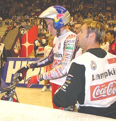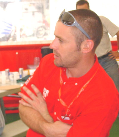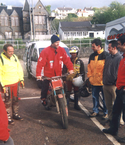 Je, je, je ! Al contrario, el lujo es para mi. Poder colaborar con un tío como Dougie es toda una suerte. Es muy profesional y también una excelente persona, al menos hasta hoy. Estoy realmente muy contento de poder ayudarle, aprecia mi trabajo, sabe que me he esforzado mucho, como siempre hago las cosas, y realmente ha sido muy correcto conmigo. Yo intento poner a su servicio la experiencia que he aprendido a lo largo de todos estos años, a nivel de estar ahí, de animar en momentos un poco diferentes. No sé, por ahora estoy muy bien con Dougie y me gustaría estar con él futuro y evidentemente que siga mucho tiempo arriba. Ya que tu mismo has sacado el tema hace un rato, y aprovechando que no está Cirera delante, ¿nos puedes adelantar algo sobre la cuatro tiempos de Montesa-Honda? Pues no sé, la verdad, tengo que preguntarselo a Miguel porque no tengo ni idea ........ (con una sonrisa maliciosa y mirando al techo de la carpa de Montesa-Honda). No, no, no, "no comment", no sé......... Perdón, pero debemos insistir... La verdad es que como ya he dicho antes me gustaría mucho formar parte de ese proyecto, y es más, ¿sabes lo que me gustaría más?, pues participar y ganar otra vez en Escocia pero con la Montesa de cuatro tiempos, ser el primero en volver a ganar los Seis Días con una cuatro tiempos después de tantos años. Lo que no sé es que año y si será así o no, pero la verdad es que esa es ahora mi meta y quizás mi mayor objetivo desde el punto de vista profesional.
