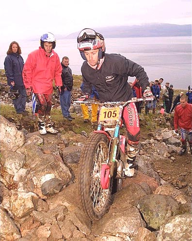 La primera pregunta es obvia, Amós, ¿se siente algo especial venciendo en Escocia? Bueno, la verdad es que cuando salí del Ben Nevis sabiendo que solo quedaba la zona del pueblo, que era de puro trámite, la sensación que tenía era de lo más agradable, y a partir de ahí ha habido una cantidad increíble de gente que me ha llamado felicitándome, en Inglaterra, en la Isla de Man, desde Estados Unidos, aquí, en todos lados, y ya os podéis imaginar que es una sensación "guay", es fantástico. Es que ganar los Seis Días siempre ha tenido una repercusión muy importante, ¿lo sabías? Desde pequeño cuando veías las crónicas en las revistas, y después cuando he ido a participar ya te dabas cuenta de que es una carrera especial, pero hasta que no la ganas no llegas a saber realmente lo que ello supone, especialmente para muchos aficionados. Yo antes pensaba que era una carrera más, un poco diferente, pero una más. Hoy lo veo muy diferente, y la verdad es que si me preguntas ahora te diré que me encantaría volver a ganarla otra vez por lo que significa. Resumiendo un poco el trial, suponemos que el principal problema para los pilotos de nivel que optabais a la victoria era la presión, los pocos puntos, lo caro que se pagan los errores en Escocia.... Bueno, el nivel para nosotros no representa demasiados problemas, pero no hay que olvidar que son nada menos que 180 zonas y además es "non stop" puro, o sea que el más pequeño contratiempo que tengas en una zona te puede costar un fiasco absurdo, y los controles son verdaderamente estrictos, es decir no regalan nada a nadie. Al final de los seis días has hecho mil kilómetros, puedes tener problemas mecánicos, el tiempo no sobra.....