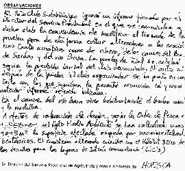 - 7 de Mayo de 2001: recibimos una comunicación del S.P.M.A. indicando que tenemos que modificar el trazado porque consideran inadmisibles las afecciones sobre el ecosistema fluvial de los ríos Basa e Isún ¿¡¡¡¡¡¡¡¡¡¡¡¡?. Hablamos con el jefe de la Oficina Comarcal Agroambiental en Sabiñánigo: resulta que dos agentes forestales de esa O.C.A. creen que han revisado el recorrido propuesto y han enviado un informe negativo(¿por qué no se pusieron en contacto con nosotros para saber exactamente por dónde iba el recorrido? Sólo disponían del trazado marcado en un plano a escala 1:50.000 y a esa escala no se aprecia por donde se circula. Por cierto, a ese informe nunca hemos tenido acceso...
