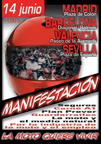 Este sábado 14 de Junio, las principales ciudades del país vivirán manifestaciones simultáneas con el lema "La moto quiere vivir" dentro de la plataforma "Por la moto". En ella se reivinidican el precio de los seguros, la equiparación del Carné A1, mejora del sistema de los guardarraíles para la proteccion de las personas en caso de que el conductor pierda el control de la motocicleta, y "la moto y el medio natural", para luchar por las indefensiones que padecemos los usuarios de la moto de campo.