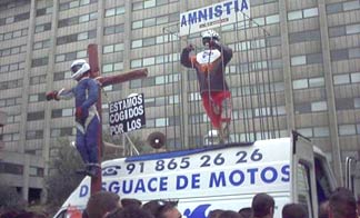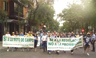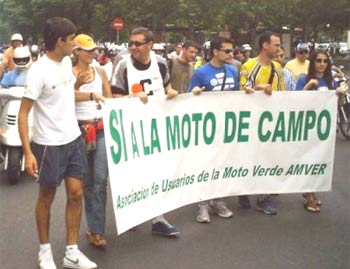 En Madrid la cosa fue bastante mejor gracias al gran esfuerzo de la AMVER, que organizó la marcha de los moteros verdes por la capital. Acudieron bastantes, especialmente endureros, y se mostraron pancartas con los lemas "La moto y el medio ambiente son compatibles", "Sí a la moto de campo" o "Sí a la regulación, no a la prohibición" que salieron en diversos informativos de televisión. El periodista Juan Ramón Lucas leyó un manifiesto y todo discurrió con normalidad. Nos hubiese gustado ver la presencia de pilotos profesionales de trial, enduro, raids, velocidad pero no pudo ser, suponemos que por coincidencias con algunas competiciones.