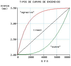 ¿Qué es un encendido programable? Simplemente un encendido cuya curva de avance automático se puede variar a voluntad. En la figura se muestran tres curvas de encendido. En negro está el avance automático lineal, en rojo un avance que denominamos "agresivo" porque a poco que aumenten las revoluciones se adelanta bastante, y en verde uno "suave" ya que el avance no aumenta hasta bastante adentrados en revoluciones. Estas curvas de avance son inventadas (no he encontrado ninguna curva real, ni creo que nadie las diga en público) pero sirven como ejemplo.